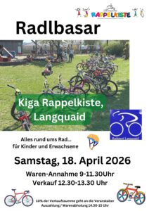Unser traditioneller Radlbasar findet auch in diesem Jahr statt. Am Samstag, 18. April ist es soweit. Ganz im Sinne der Nachhaltigkeit werden Fahrräder für alle Altersgruppen, Zubehör und Kinderfahrzeuge aller Art angenommen und zum Verkauf angeboten.