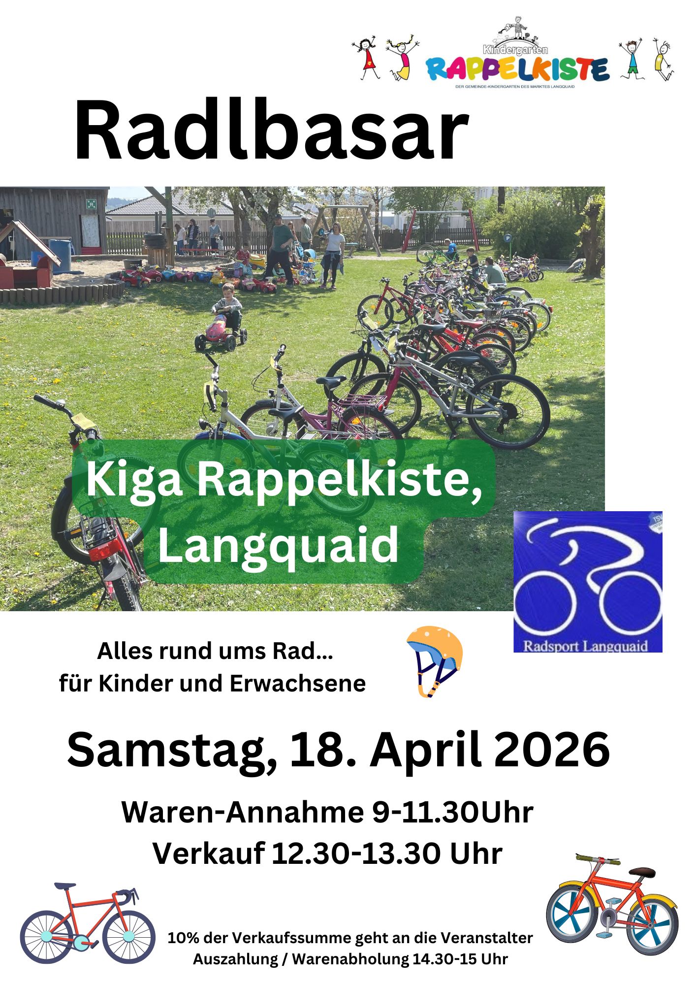 Unser traditioneller Radlbasar findet auch in diesem Jahr statt. Am Samstag, 18. April ist es soweit. Ganz im Sinne der Nachhaltigkeit werden Fahrräder für alle Altersgruppen, Zubehör und Kinderfahrzeuge aller Art angenommen und zum Verkauf angeboten.